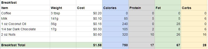Although it took me quite a few hours to collect all this data on what I eat and add it up in a spreadsheet, the results have been quite interesting because I had never done it before. With just the stuff described above, I arrived at this point: