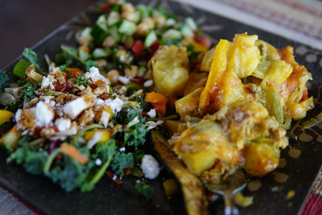 Another typical dinner – main dish is based on potatoes/veggies plus fancy sausages baked into a cheese-laden casserole.